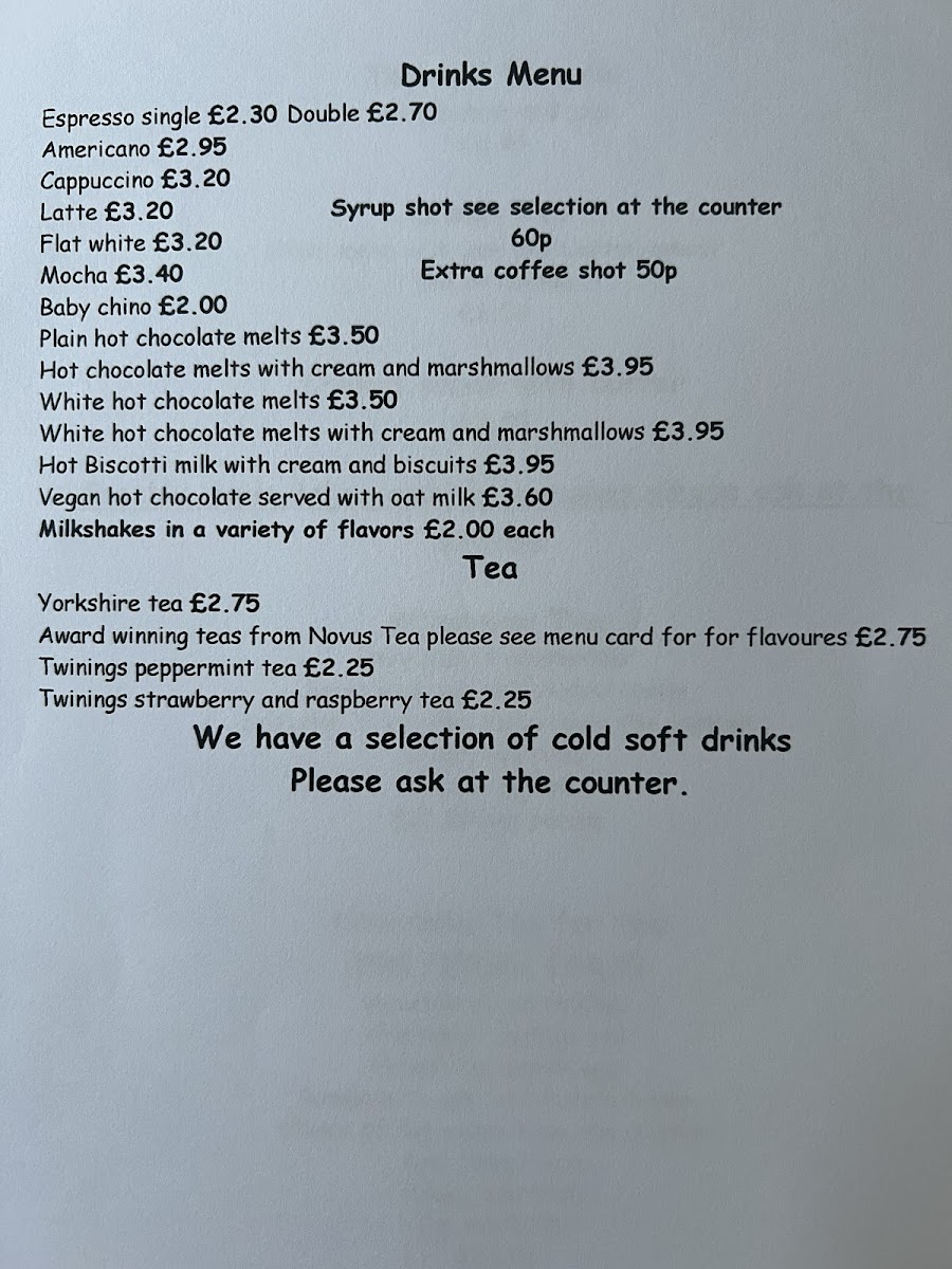 The drinks menu features a comprehensive selection of coffee options, including Espresso (£2.30), Americano (£2.95), Cappuccino, Latte, and Flat White (all £3.20), as well as Mocha (£3.40). For a non-coffee alternative, there are various hot chocolate melts, available plain or with cream and marshmallows, and vegan hot chocolate served with oat milk. Prices for hot chocolates range from £3.50 to £3.95. Additionally, there is a Baby Chino offering priced at £2.00, and Hot Biscotti Milk with cream and biscuits at £3.95.